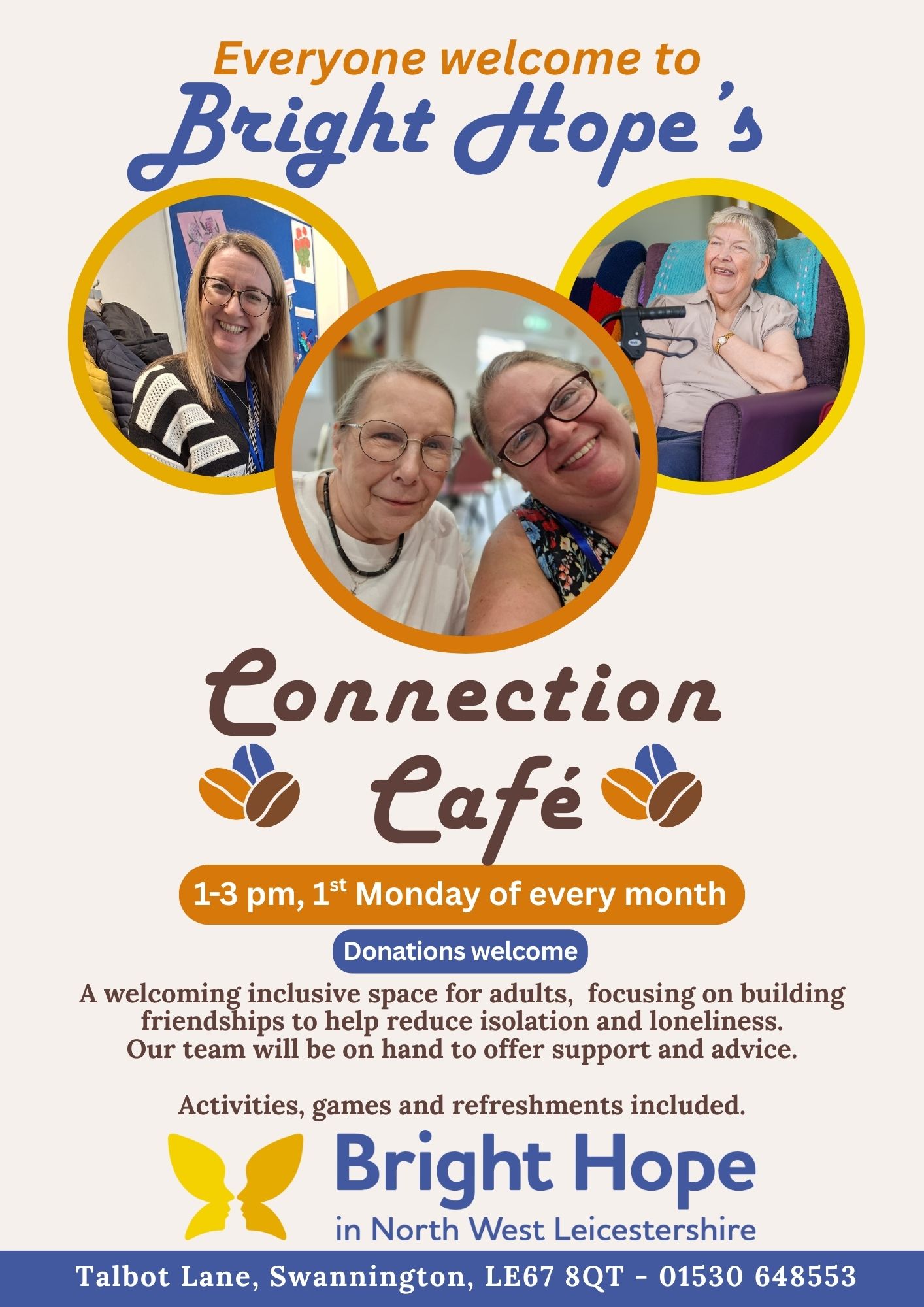 The Connection Café operates on a drop-in basis on the first Monday of each month at Bright Hope House, from 1pm until 3pm. Taking place in our light, airy and comfortable Day Care room, light refreshments will be served. There is no charge for attending, but donations are welcomed.